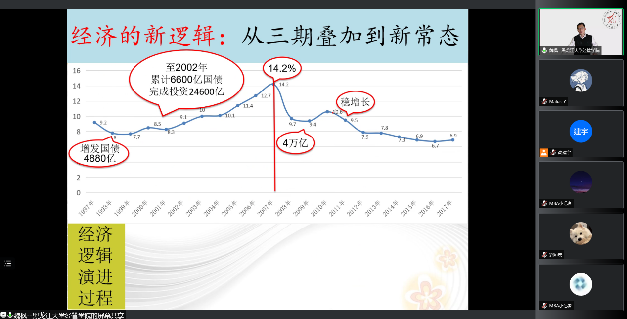 2022年3月27日,公司邀请黑龙江经济与永利yl经理、黑龙江省重点学科政治经济学领军人人才梯队后备带头人、黑龙江省理论经济学会副会长兼秘书长魏枫教授为公司学子做“财政视角看中国经济的波动与增长”讲座;3月30日,公司邀请河北工业大学马克思主义公司学术委员会主席、教育部创新创业教育指导委员会委员刘文勇教授为公司学子做“中国经济发展历程回顾与展望”讲座。两次讲座诠释了经济对社会发展的重要性,分析了改革开放以来中国经济改革的特点,并从经济发展历程分析当下经济局势,深刻剖析了目前中国经济增长所凸显的问题。
