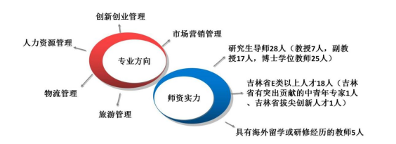 本专业经过多年的积淀,目前已形成了创新创业管理、市场营销、人力资源管理、旅游管理和物流管理5个稳定的研究方向。本学位点现有研究生导师28人,副教授以上教师占比86%,其中教授7人,副教授17人;研究生导师中博士学位教师25人,占比89%。吉林省E类以上人才18人,其中吉林省有突出贡献的中青年专家1人、吉林省拔尖创新人才1人。硕士生导师具备海外留学或研修经历的教师5人,占比18%。